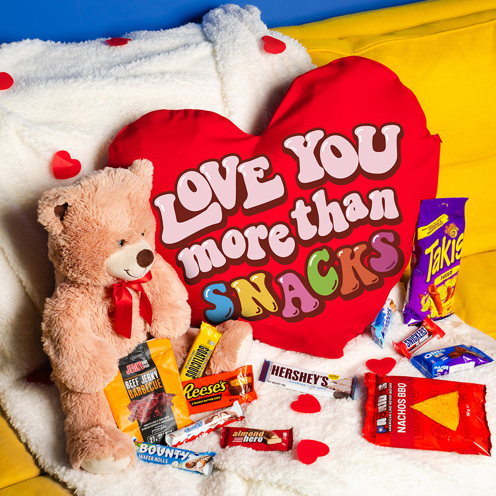Valentine’s Heart XXL, heart-shaped cushion with 70 sweet and savory surprise snacks, is a seasonal product designed for retail stores that want to capture attention on Valentine’s Day and maximize sales during peak days. A heart-shaped cushion in extra extra large size that contains 70 sweet and savory surprise snacks, selected from internationally recognized brands with strong appeal to young audiences.