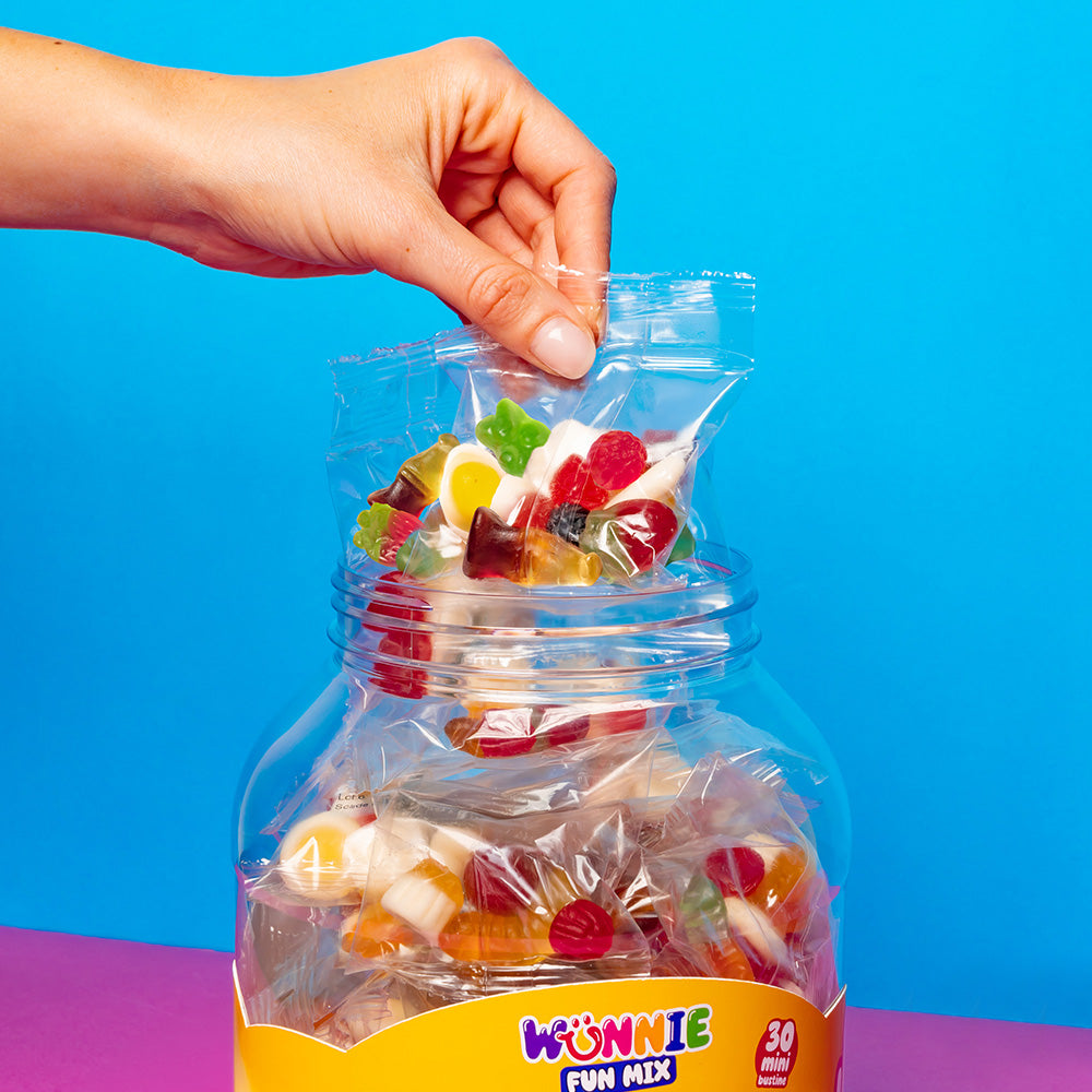 Wunnie Fun Mix, jar with 30 single-serving bags of gummy candies in assorted flavors. A magnet product for those with a sweet tooth looking for original party favors, bombonieres, or single-serving stock. Available in two different colors, this format is practical and ideal for stimulating impulse purchases. Affordable price and versatility of use make this product a must-have for your store!
