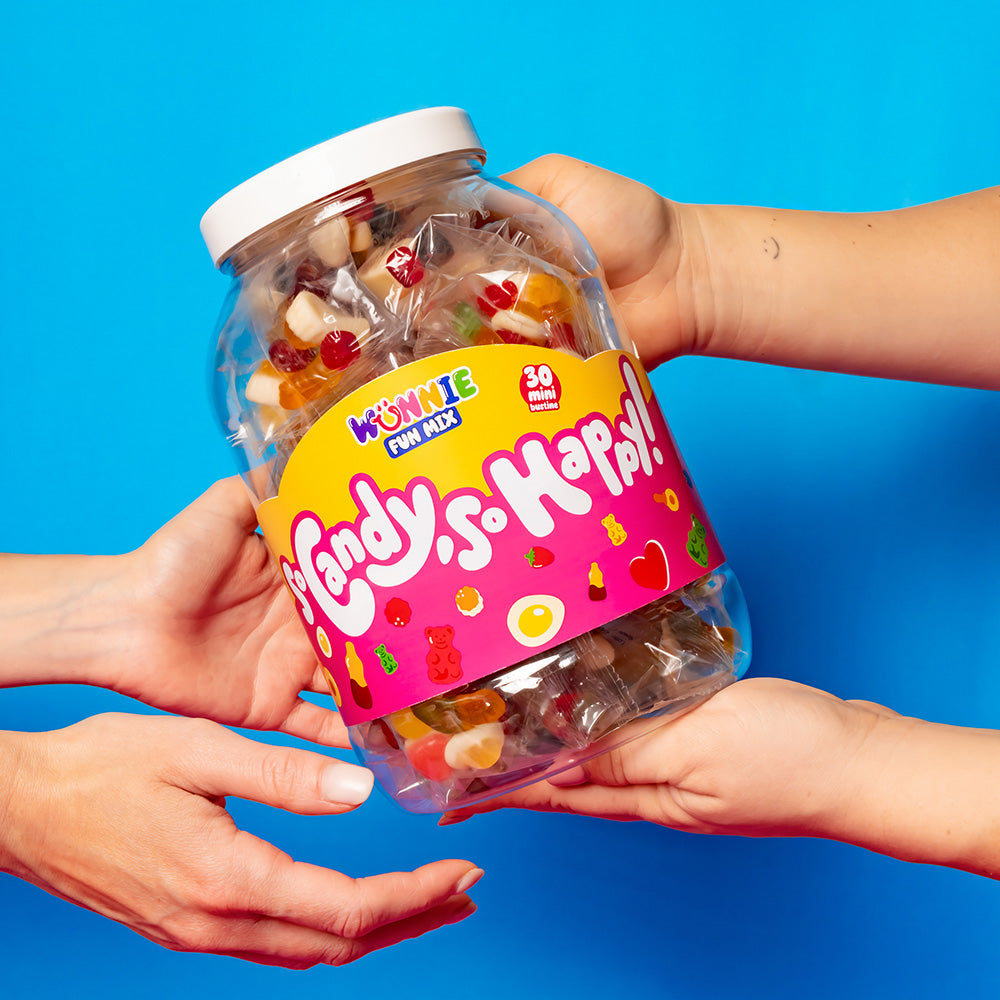 The Wunnie Fun Mix jar is the perfect solution for those who want to stand out on the shelf with an original, colorful, and incredibly versatile product. With 30 single-serving bags of assorted gummy candies, it is ideal for offering end customers aready-to-use idea for modern favors,end-of-party gifts, party bags or small thoughts to share..