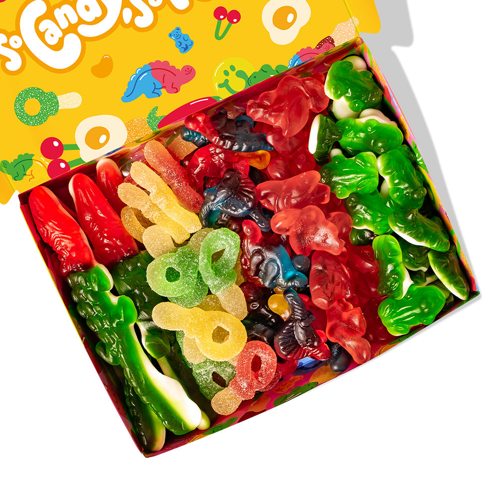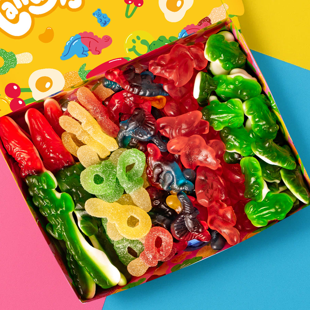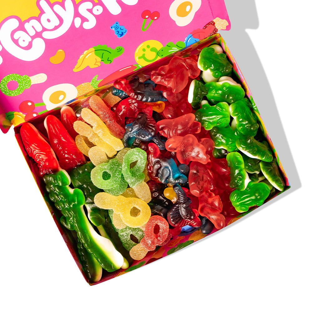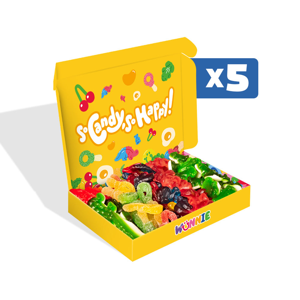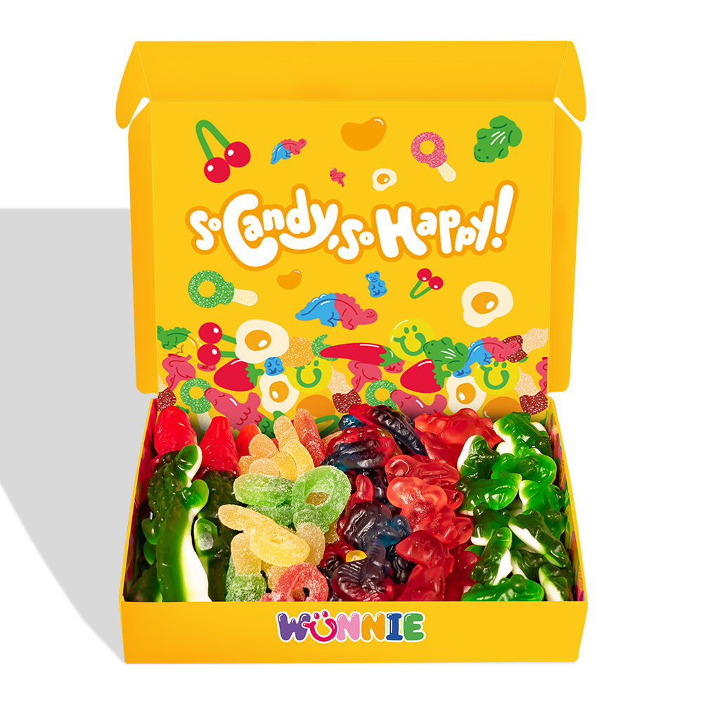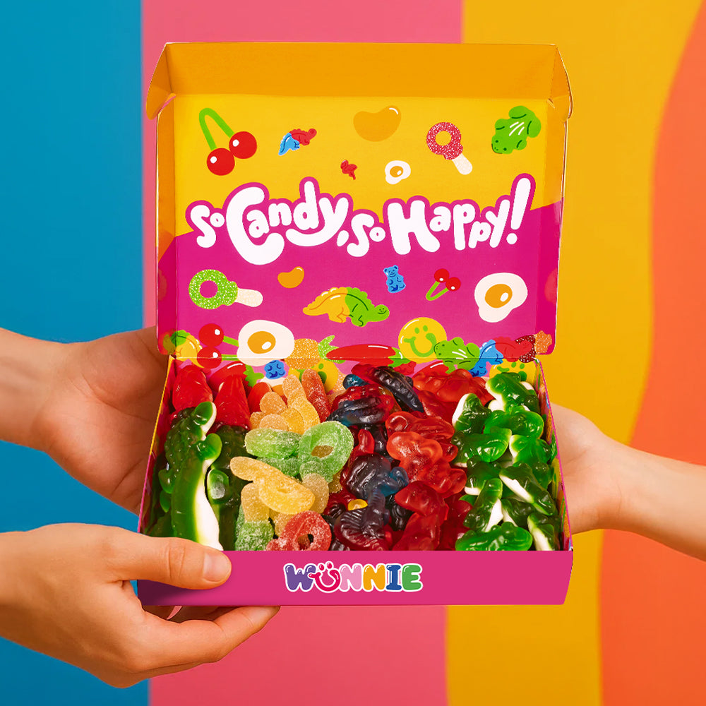 Wunnie Box “So Candy, So Happy”, 5 boxes of gummy candies in assorted flavors of 480 g. This brand new product - available in two different versions - is designed to capture attention on the shelf and trigger impulse purchases. Each box includes 5 flavors of gummies for a total of 480 g: XL crocodile, Flamingos, Fizzy Keys, Dinos and Frogs - exclusive shapes that your customers will hardly find elsewhere. Bring the original Candy box to your store and make your customers happy!