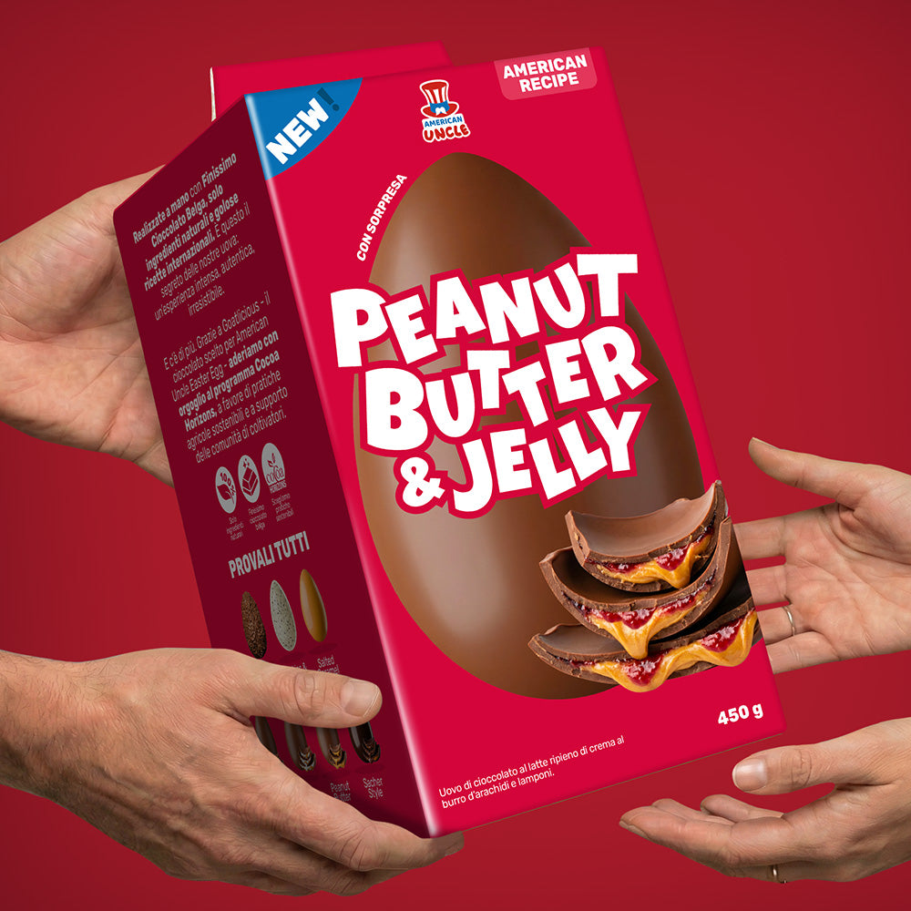 American Uncle Peanut Butter & Jelly Oster-Ei 450 g ist inspiriert vom berühmten amerikanischen PB&J-Rezept. Ein Milchschokoladen-Osterei, gefüllt mit Erdnussbuttercreme und Himbeeren, neu in der Familie American Uncle. Es ist ein Geschmack, der eine absolute Neuheit auf dem Markt ist, gedacht, um die Aufmerksamkeit der Kunden zu erregen und deinen Verkaufsort zu einem echten Ziel für diejenigen zu machen, die zu Ostern etwas anderes als das Übliche suchen.