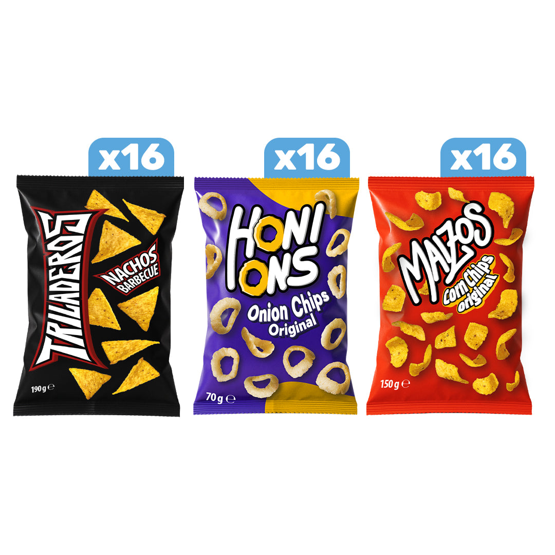 Agregue a sus honiones de surtido, maicena y triladeros con este paquete completo: tres chips salados, tres sabores diferentes, una sola oportunidad para conquistar cada cliente.